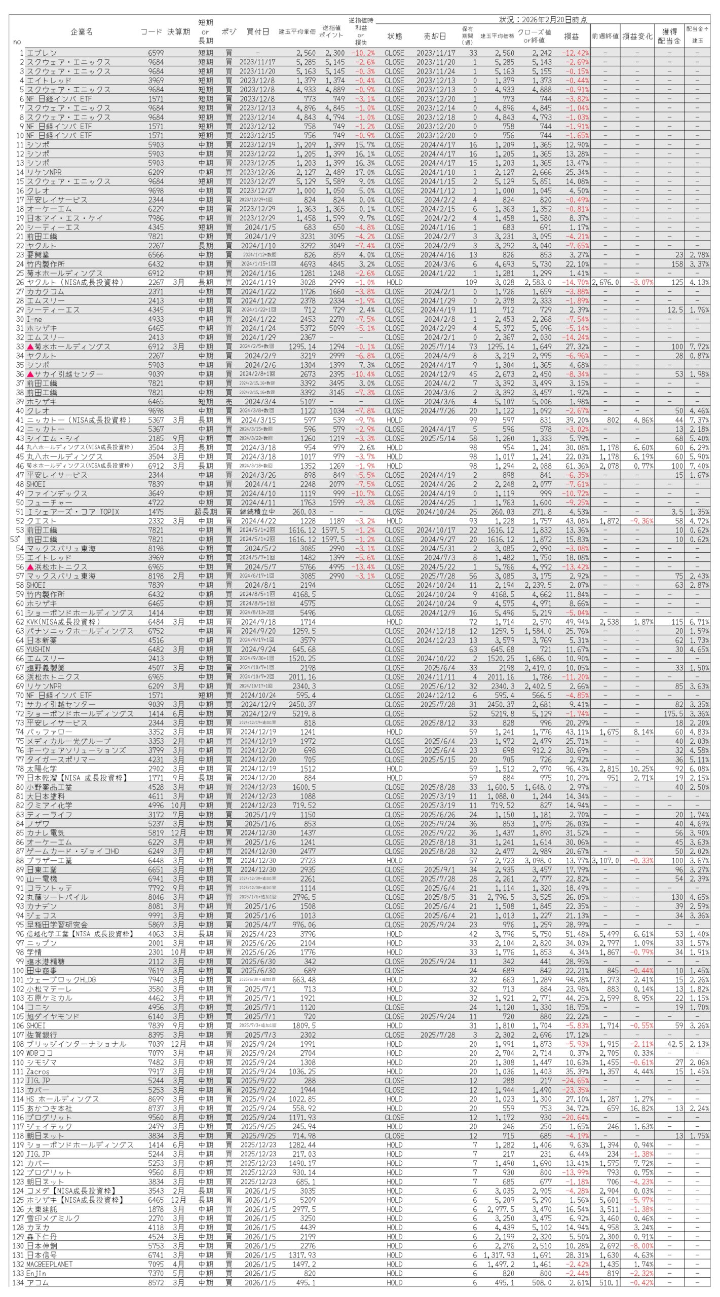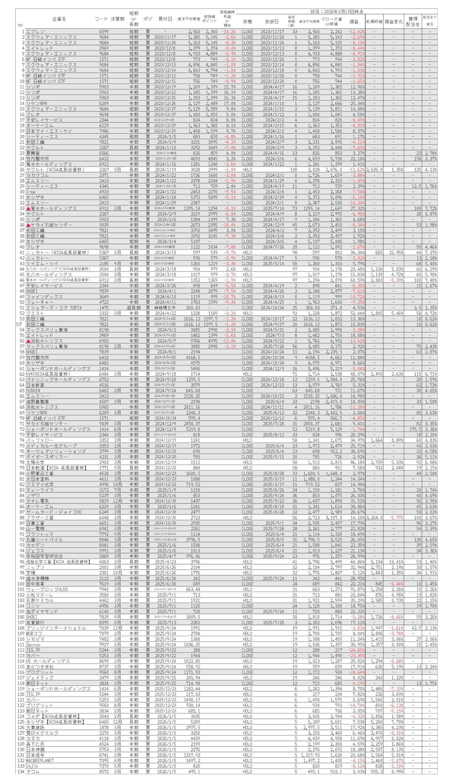 今週の日経平均は、先週末から1000円程度上げて54250円で引けています。手持ち銘柄は、決算発表の結果でまちまちな感じですが、総じて上げたものが多く、含み益は先週減った分を丸々取り返して今年に入って最も増えています。金曜の日経先物はまた上昇していて、日曜の選挙で自民党が勝利すると月曜は大幅上昇になりそうです。持株に恩恵があるかはわかりませんが・・・。振り子は忘れずに、上がれば下がるものなので利確も考えていこうと思います。引続きぼちぼちです。